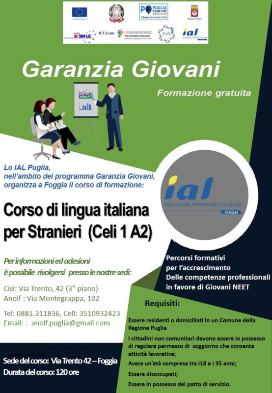 Insieme a Ial Puglia Bari, si propone un corso gratuito di Lingua Italiana per stranieri (Celi 1 ' A2), con la ce...